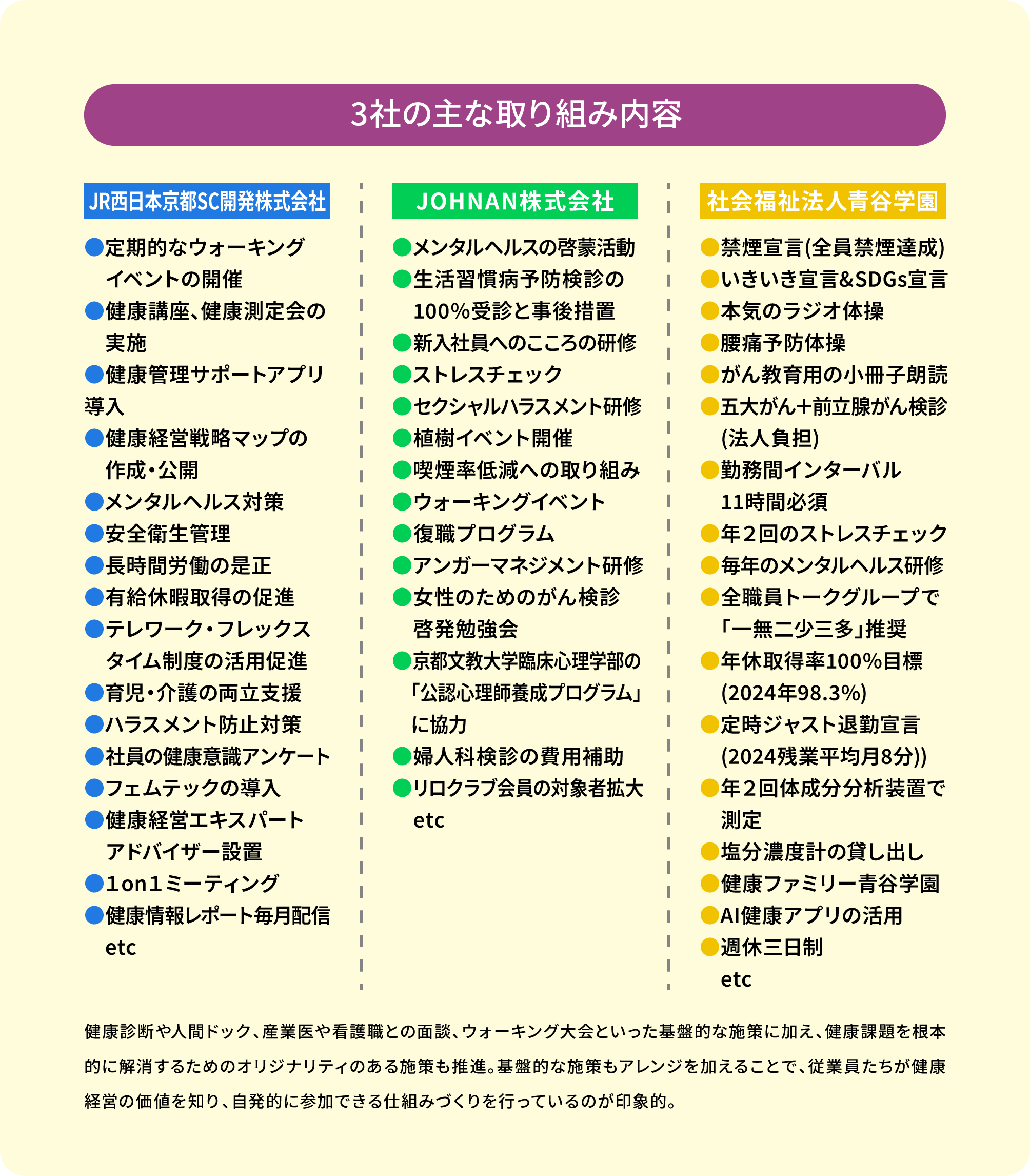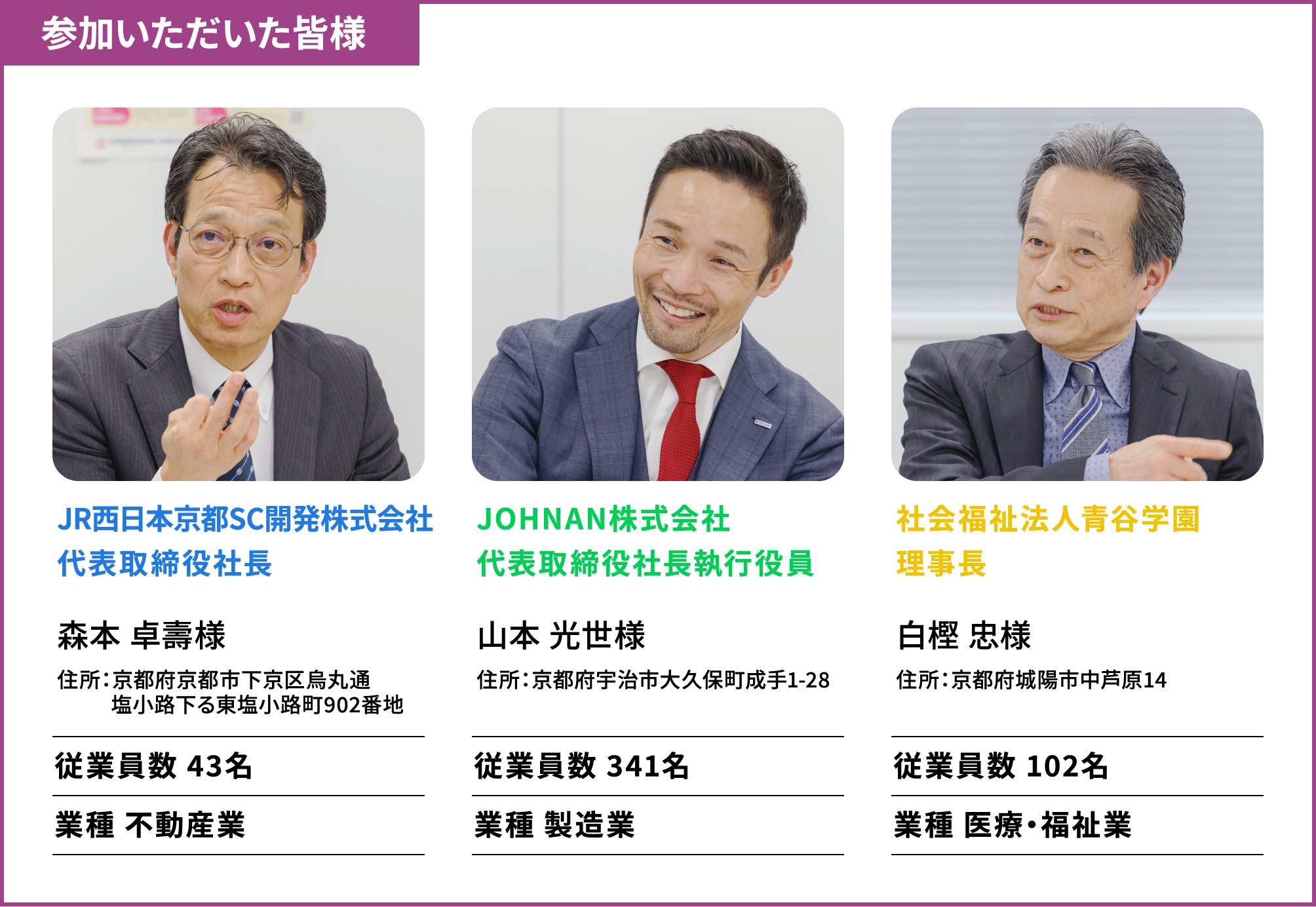 今回、協会けんぽ京都支部において、京から取り組む健康事業所宣言のみならず、健康経営優良法人、きょうと健康づくり実践企業認証を受けている3社に、具体的な施策や成果、今後の健康課題などについて意見交換していただきました。