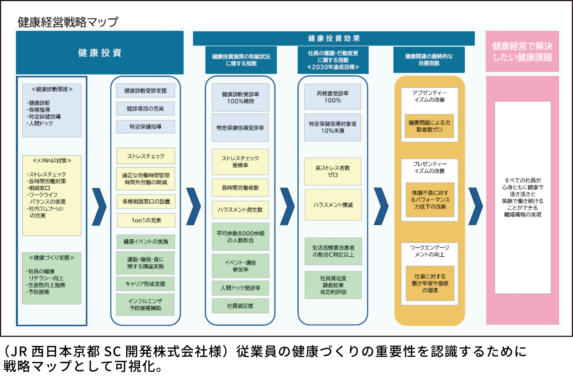 JR西日本京都SC開発様の戦略マップを拝見しましたが、基本概念から具体的な手順、ひいては従業員の活力向上や生産性の向上まで、組織を活性化させるスキームを描かれているのですね。当社の健康経営を振り返ったところ、時流や社内の課題に応じてこれまで様々な施策を行ってきたことが明らかになりました。例えば、食堂での受動喫煙が問題となった2012年には、喫煙所を屋外に移動させて完全分煙を図り、禁煙希望者に対して禁煙外来を紹介。長期休暇後の離職が続いた2013年には、「復職支援プログラム」と銘打って産業医、産業保健スタッフ、公認心理師が連携し、休職者のストレス緩和やセルフケアのアドバイスを行いました。さらに2025年には、運動施設の利用機会を創出することを目的に、契約している福利厚生サービスの利用対象者を正社員のみから契約社員まで拡大。このように、その時々のニーズに応じて施策を更新することで、従業員が健康で、よりいきいき活躍できる組織を目指してきました。
