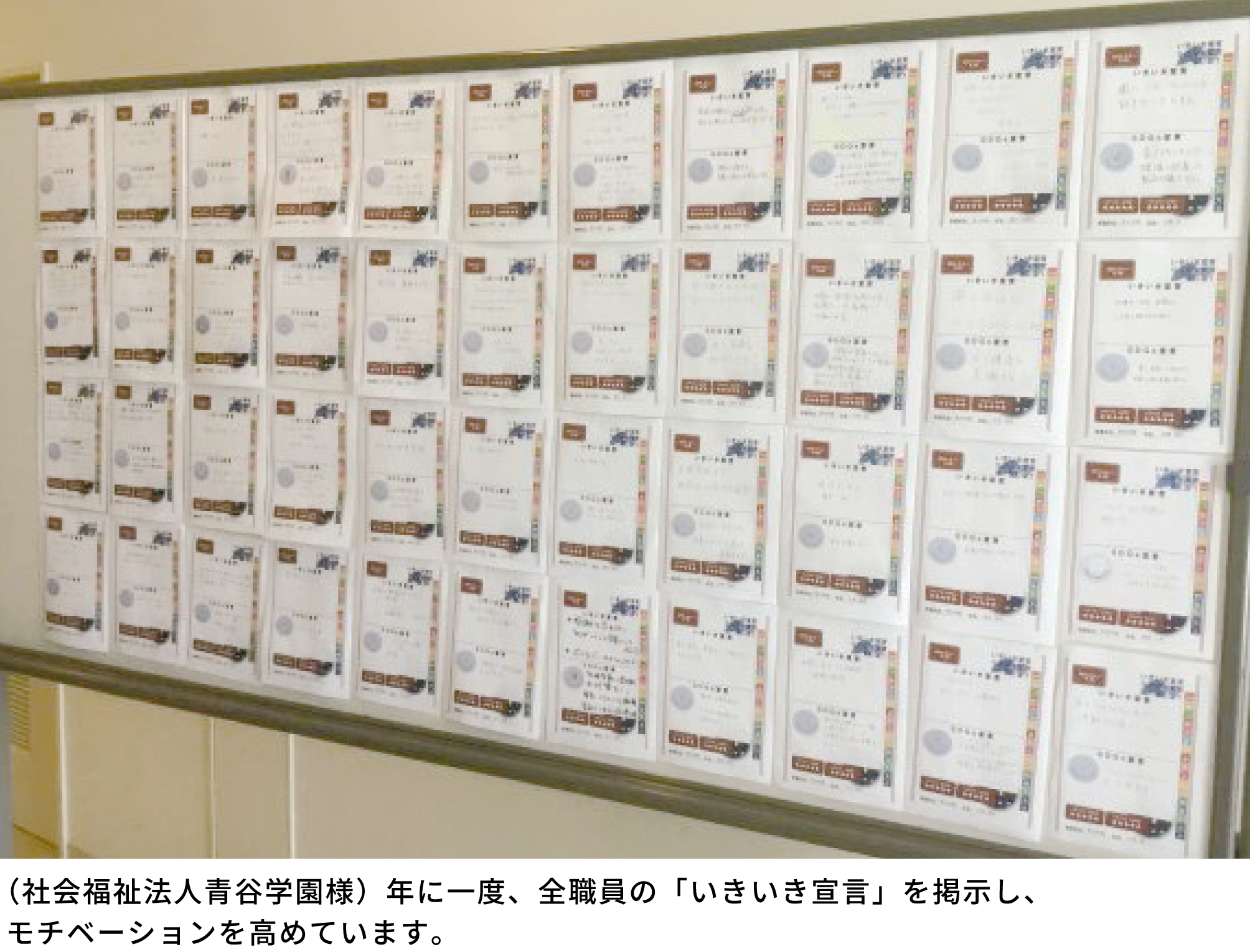 はい。そのひとつが、「禁煙宣言」です。11年前、産業医の禁煙講座に参加した一人の職員が「喫煙の怖さがよく分かりました。頑張って禁煙します。」と私に報告してくれました。それを受けて、その場で「禁煙宣言」を書いてもらい、職員たちの目に留まる休憩室に貼り出すことにしたのです。すると、彼は見事に禁煙に成功し、「自分の努力をみんなが見ていると思うと頑張れました。」と前向きに語ってくれました。これが「禁煙宣言」の第一号で、この後も感化された職員たちが続々と禁煙に成功していきます。当初は「絶対に止められない」と断言していた職員もいつの間にか禁煙し、今では喫煙者0人の職場になりました。紙に書くというのは、アナログと思われるかもしれませんが、書くことで自分を追い込み、目標達成に向けたモチベーションが高まる効果があるようです。また同じ手法で、全職員が年に⼀度、いきいきと働くためにやるべきことを書いて貼り出す「いきいき宣言」も導入しています。同取り組みは独自性のある点が評価され、「第6回きょうと健康づくり実践企業」において、特別賞を受賞しました。